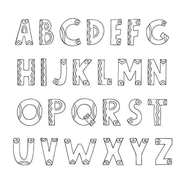 装飾的な手描きのABCラテンアルファベット。かわいい英語の活版印刷フォント、スカンジナビアスタイルの文字、黒と白の落書きスケッチベクトルイラスト。点と線で設定された教育レタリングPremiumベクトル素材。