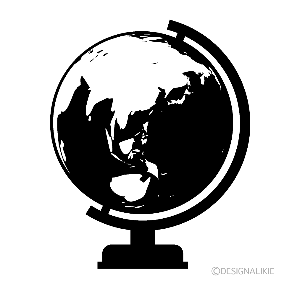 白黒の地球儀イラストのフリー素材イラストイメージ。