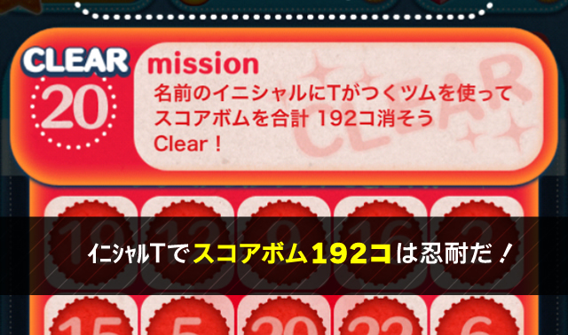 ツムツムビンゴ8枚目20 イニシャルがTでスコアボム192無理。