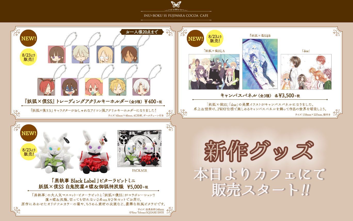 妖狐×僕SS 藤原ここあカフェ on X: " 新グッズ販売スタート🎊妖狐×僕SS・藤原ここあカフェ 💛トレーディングアクキー💛キャンバスパネル 💛黒執事BlackLabelビターラビットミニ 妖狐×僕SS の販売が本日よりスタート❗️✨カフェにお越しの際は新作グッズもチェック。