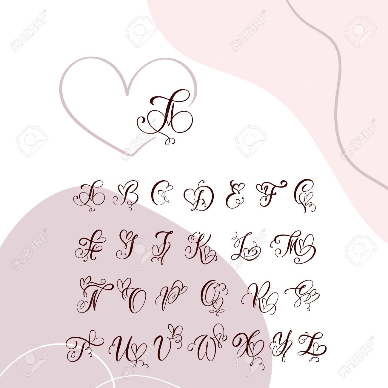 手書きの心書道モノグラムアルファベット。ハートフォントが繁栄するバレンタイン筆記体フォント。かわいい孤立した文字。はがきやポスターの装飾的なグラフィックデザインに。のイラスト素材・ベクターImage 144864626。