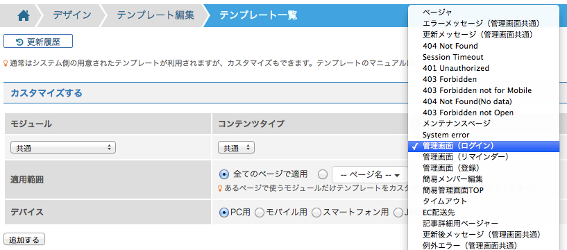 テンプレート管理管理画面bingo!CMS マニュアルサイト。