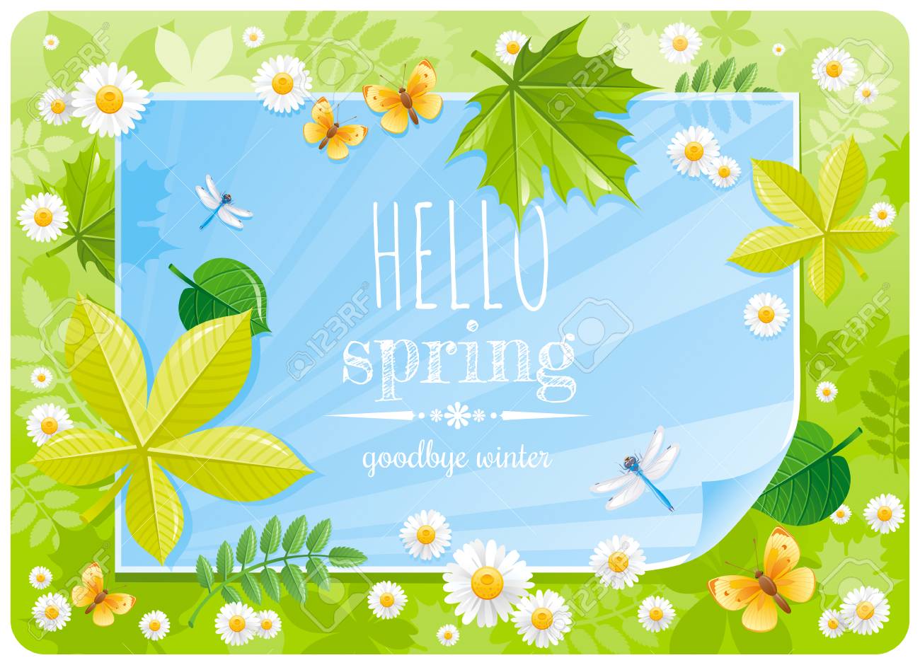 こんにちは春バナー枠ポスター。森林、草、青い空、デイジーの花、葉、蝶。春の自然。紙シート Copyspace。ベクトルの図。フラットのグリーティングカード背景、テキスト文字のイラスト素材・ベクター Image 80493439。