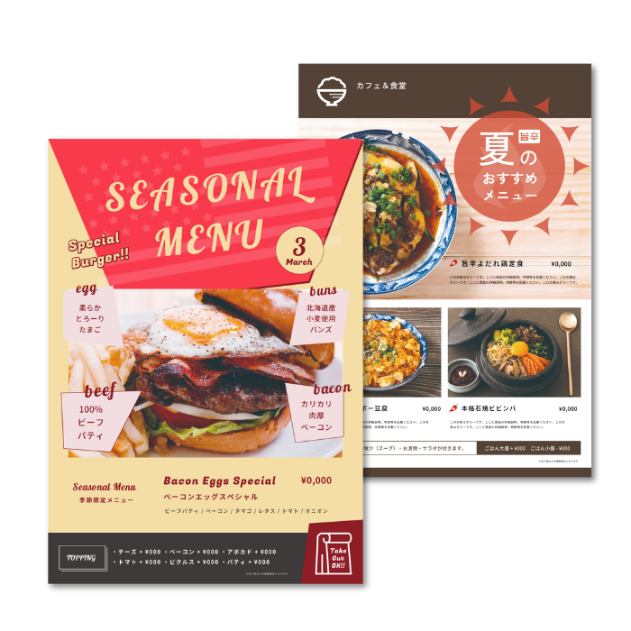 飲食店のメニュー表無料テンプレート・デザインサンプル - ネット印刷グラフィック。
