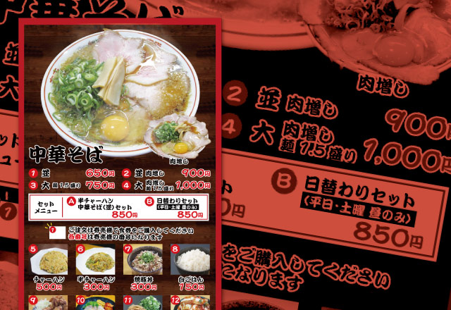 天下ご麺様のメニューポスター滋賀県で広告・求人・写真撮影依頼・ブランディングのことなら株式会社s.create エスクリエイト広告、おでかけmoaの出版、イベント、滋賀の住宅情報サイトしがのいえ。、ホームページ制作等、プロモーション全般を受付中。