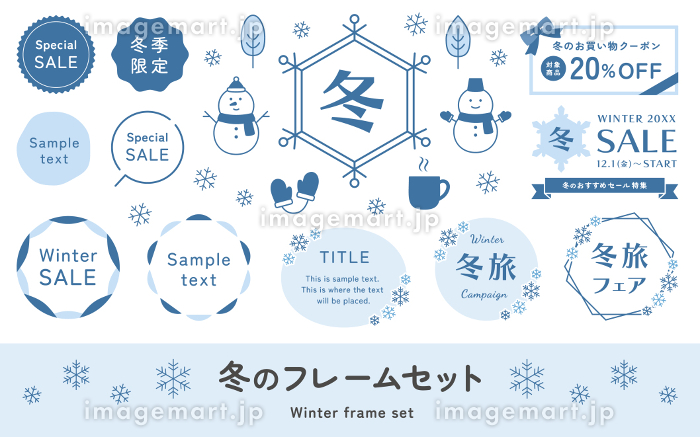 冬のフレームと雪の結晶、雪だるまのイラストセット。かわいいベクター素材、タイトル文字、見出しロゴ。226778692 毎月1点無料 フリー のストックフォト イメージマート。