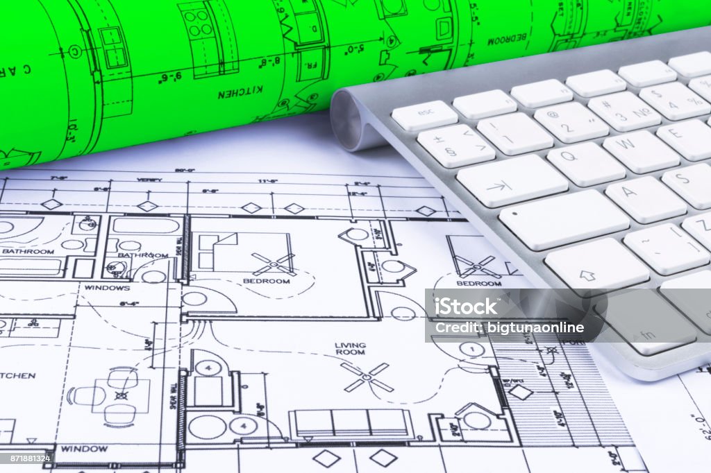 コンピューターのキーボードとモダンな家の建築設計図の図面建築設計図青写真のロールパンや作業テーブルの描画装置コンパスを描く予定です -ひらめきのストックフォトや画像を多数ご用意 - iStock。