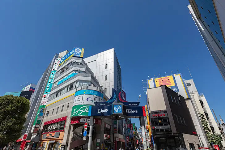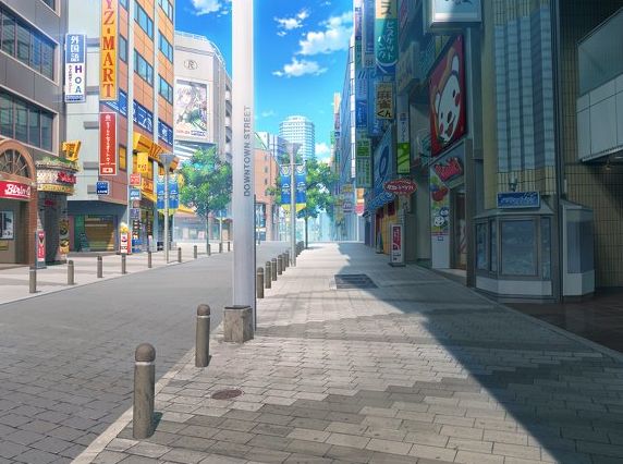 フリー素材繁華街の駅前 3枚背景イラストみんちりえ。