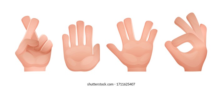 絵文字ハンドサイン。指を広げたジェスチャー、ヤギのサイン、注意の象徴、勝利、平和と尊敬。上げられた手は、意味のあるさまざまなジェスチャーを示します。ベクトルイラスト。のイラスト素材・ベクターImage 180907344。