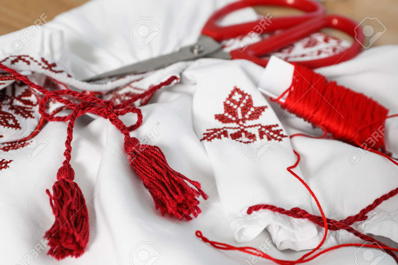 美しい刺繍デザイン、糸とはさみ、接写を持つ白いシャツ。ウクライナの国民服の写真素材・画像素材 Image 189565481。