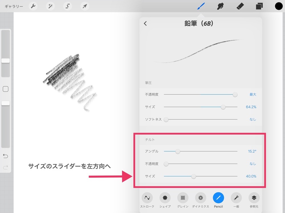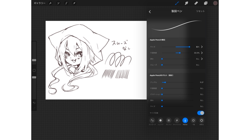 ブラシスタジオの設定⑨:Apple Pencil 筆圧や傾きに応じて、ブラシサイズや不透明度などが変化。