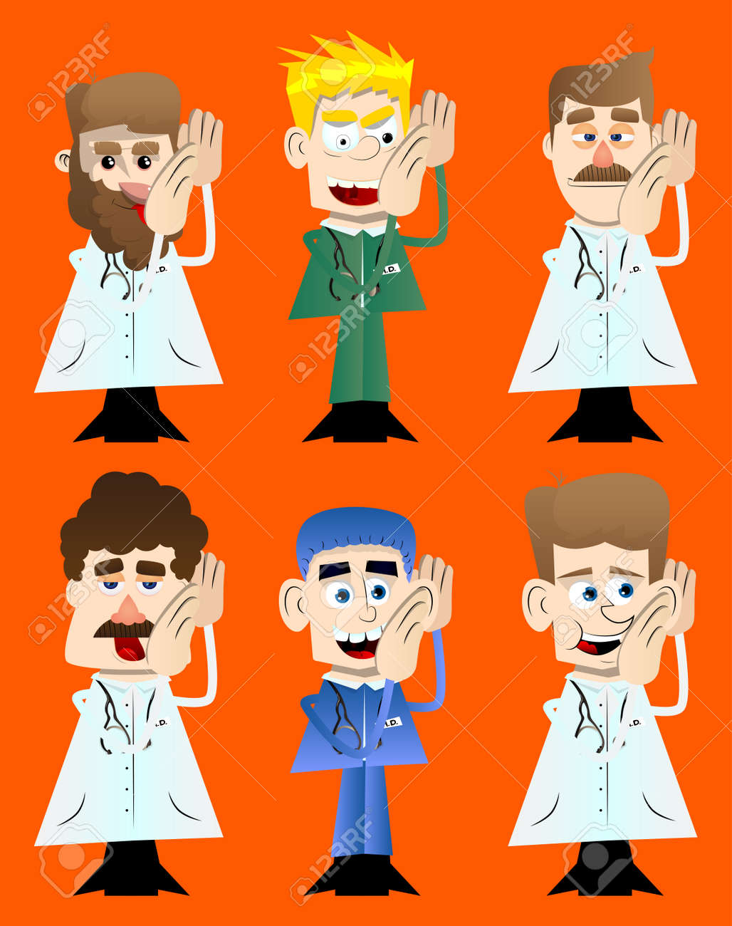 面白い漫画の医者は彼の耳に両手を握っています。ベクトルイラスト。聞いている医療従事者。のイラスト素材・ベクター Image 171789251。