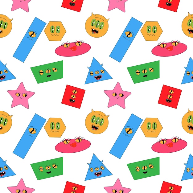 かわいい幾何学模様のシームレスなパターンをベクトル白い背景の上の顔を持つトレンディな幾何学的図形の文字子供と子供たちのデザインのドットを持つかわいい 面白い笑顔の形の文字Premiumベクトル素材。