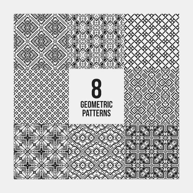 8つの複雑なモノクロの幾何学模様のセット。シームレスな背景、繊維のデザインに役立ちます。Premiumベクトル素材。