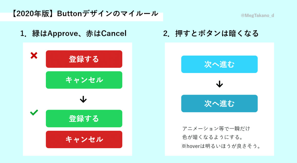 Meg Takano🌻 on X: "WEBサイトやアプリのボタンをデザインする際に私が意識していることをまとめました。uiデザイン駆け出しUIデザイナーと繋がりたい https:t.co j7Wtl6jQkI"X。