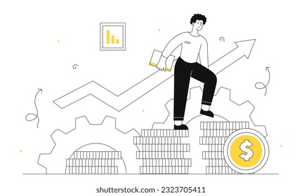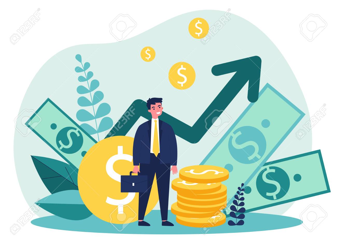 成功した起業家のベクトルイラスト。財政の進歩の概念としての収入と利益の成長。給与、預金または口座のお金が上昇し、富として上向きの象徴的な矢印。のイラスト素材・ベクターImage 170327128。