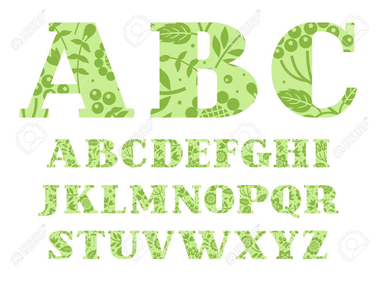 英語のアルファベット、ベリー、ハーブ、ライト グリーン、ベクトルします。英語のアルファベット。セリフ付きの英大文字。光の緑色の文字の暗い緑の果実や枝を描いた。のイラスト素材・ベクターImage 84134539。
