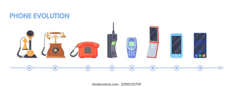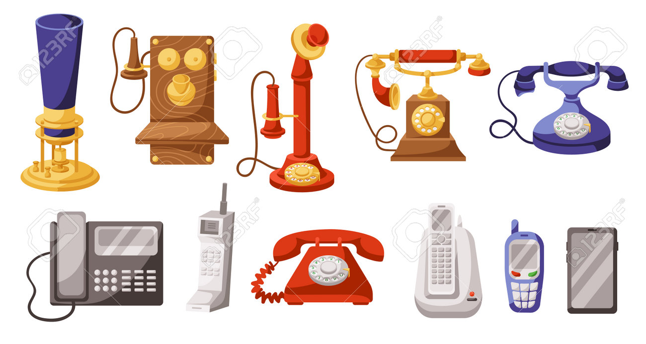 電話の進化。発明から現代の古いビンテージ電話とスマートフォンガジェットの漫画のベクター画像セットまでの電話の歴史のイラスト素材・ベクター Image195625091。