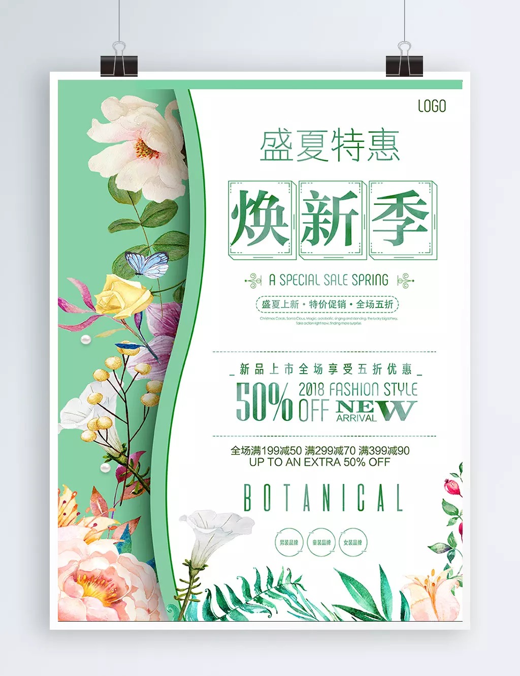 緑の新鮮な花の背景なめらかなシンプルな夏のポスターデザインイラストテンプレート素材PSDダウンロード。