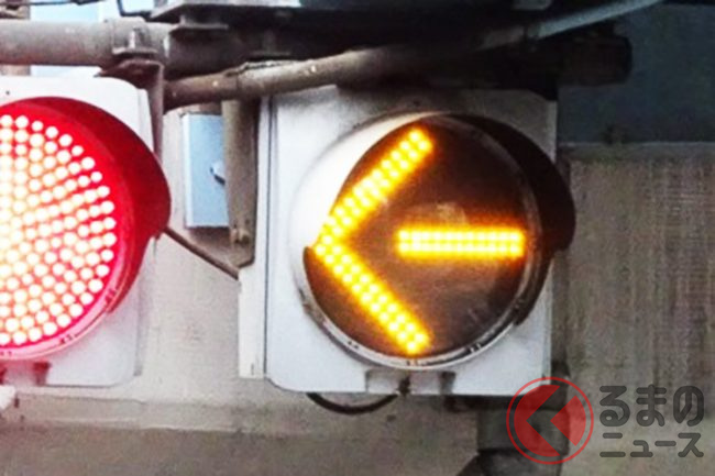 矢印の方向に進むと違反? レア度MAX!「黄色の矢印信号機」とはくるまのニュース。