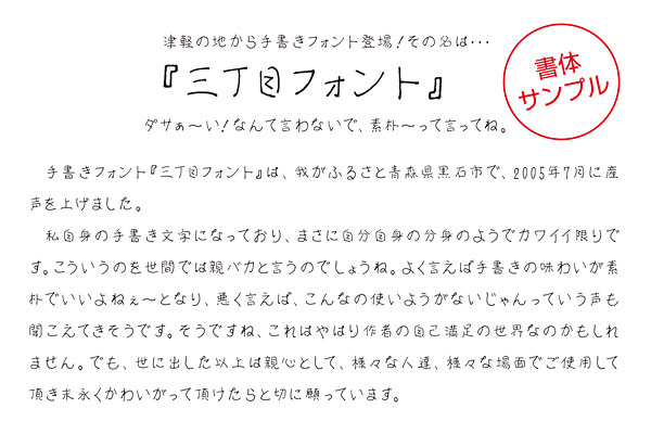 無料素材丁寧に書かれた素朴な文字の手書き風日本語フリーフォント「三丁目フォント」。