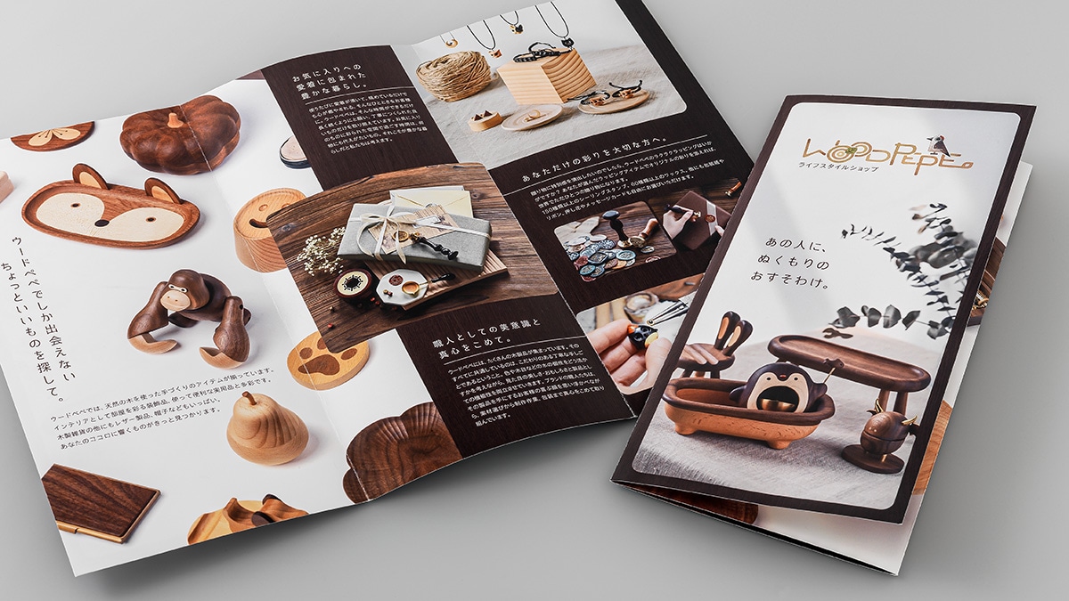 雑貨ショップ 木製・レザー リーフレットデザイン会社案内 パンフレット専科。