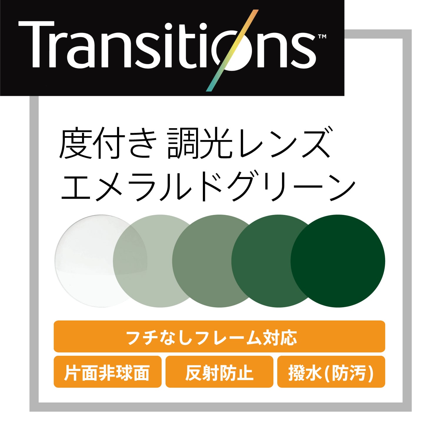 トランジションズ 度付き調光レンズ 通常納期・約1週間 通販 エメラルドグリーン・薄型〜超薄型・片面非球面設計 ポンメガネ。