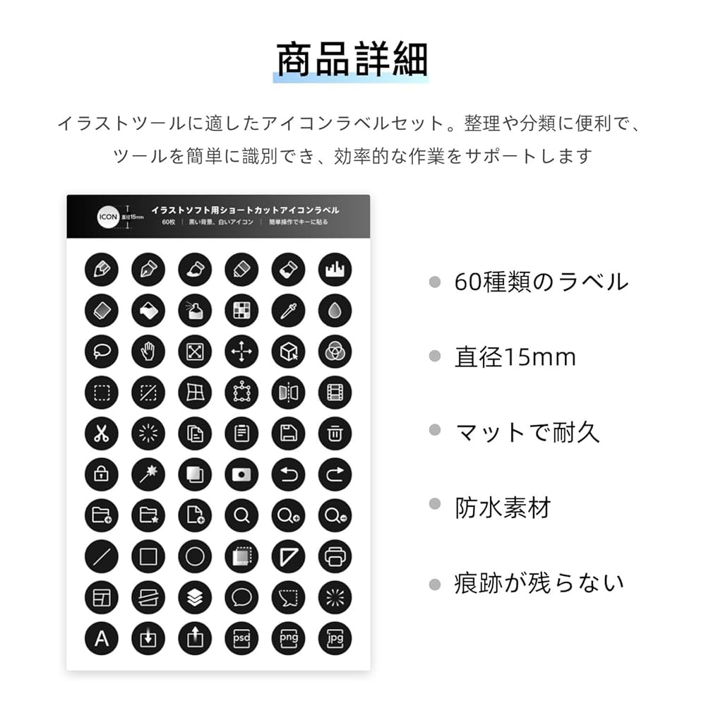 新品 イラストツール向け ショートカット アイコンシール 60枚 ラベル直径15mm ラベル テンキー 左手デバイス 片手デバイス用 キーボードシール ミラーコート紙 防水シール ホワイト- メルカリ。