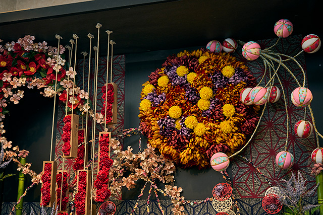 造花アレンジ 和の壁面装飾横浜ディスプレイミュージアム。