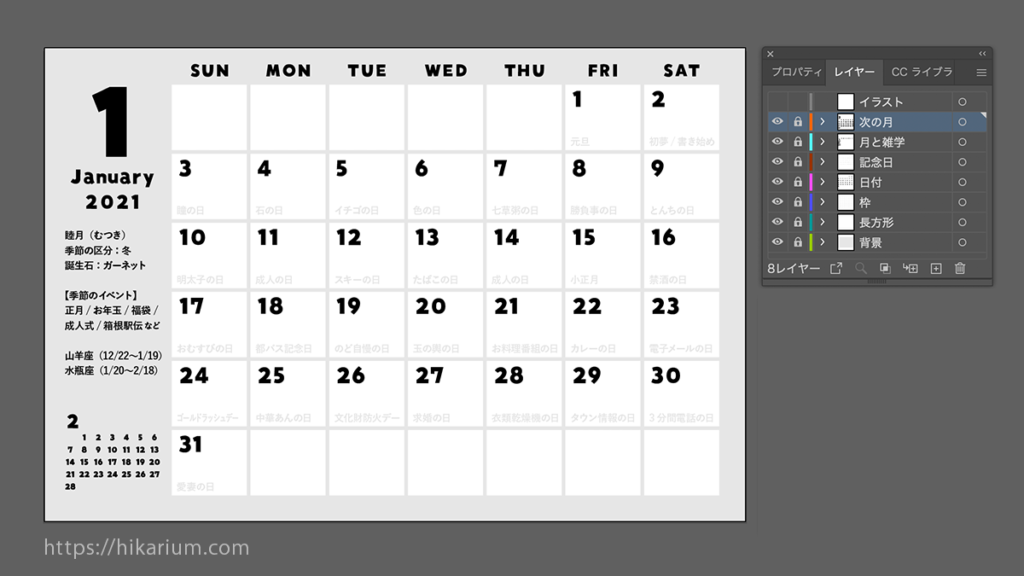 作り方 Illustratorでカレンダーを作るよ! 虎の巻hikarium。