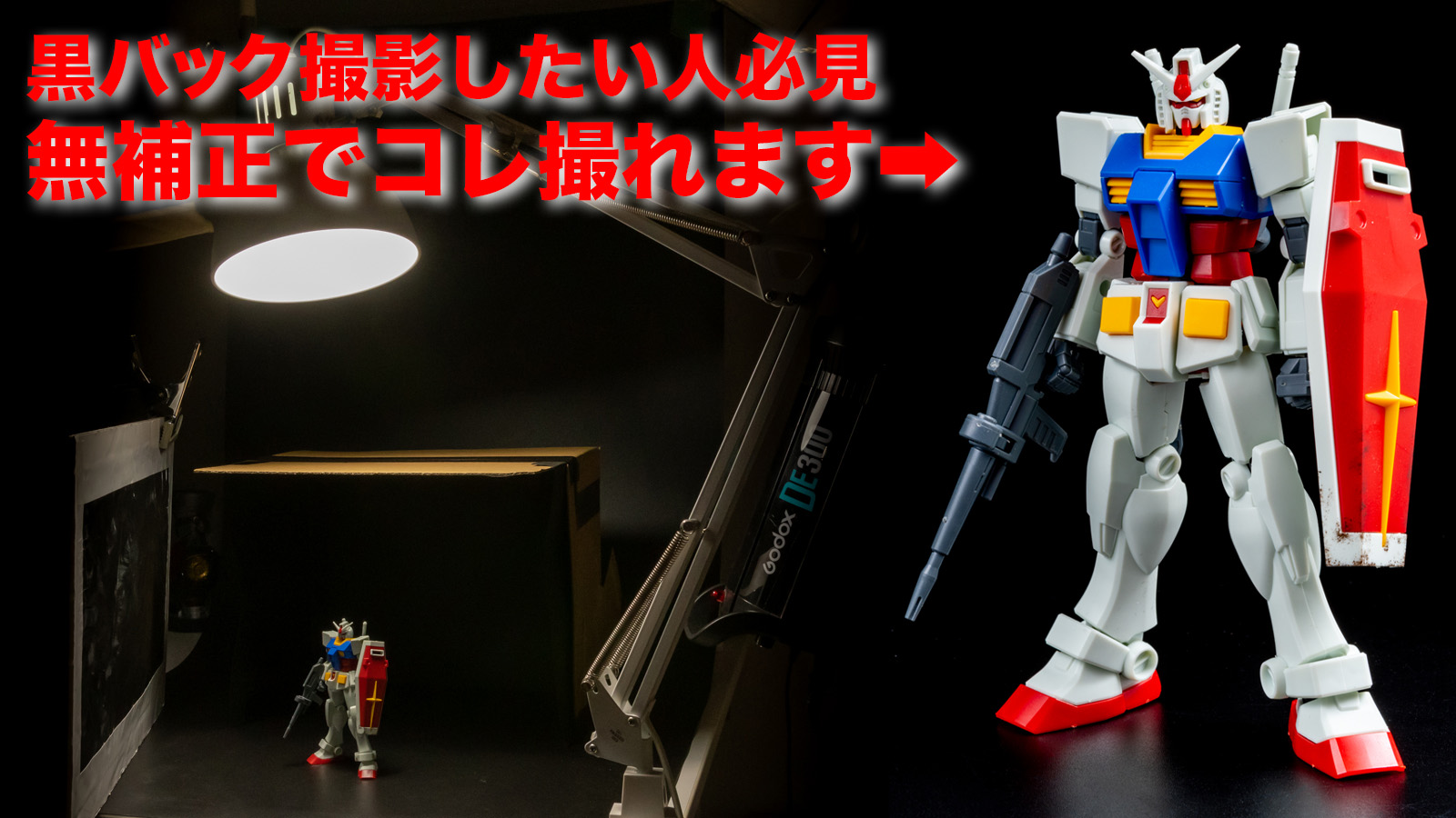 ガンプラ 撮影ブース 100均商品で自作してプラモデルをカッコよく撮影する方法 黒背景版ヒガダイのガンプラ。