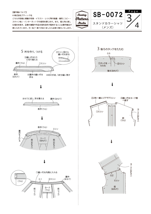 型紙 パターン 販売 型紙ダウンロード販売 スタンドカラーシャツ メンズ用Sサイズ DLsb-0072S。