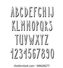 落書き風狭いアルファベット、ベクター手書きの文字、細いサンセリフ、狭い3Dフォント。本、ポスター、はがき、ウェブ手描きのスタイルタイポグラフィー用の装飾フォント。」のベクター画像素材 ロイヤリティフリー348628277Shutterstock。