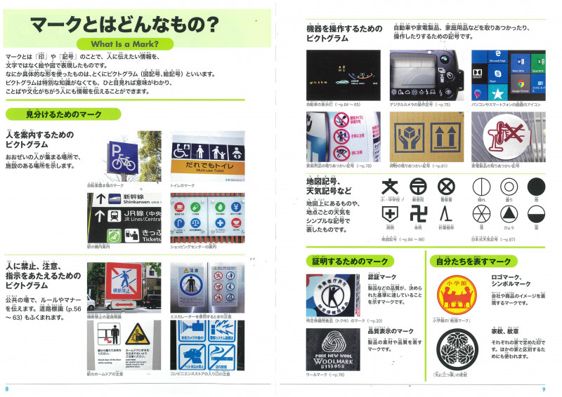 身のまわりの気になるマーク・記号が1400以上!『キッズペディア マークの図鑑』小学館。