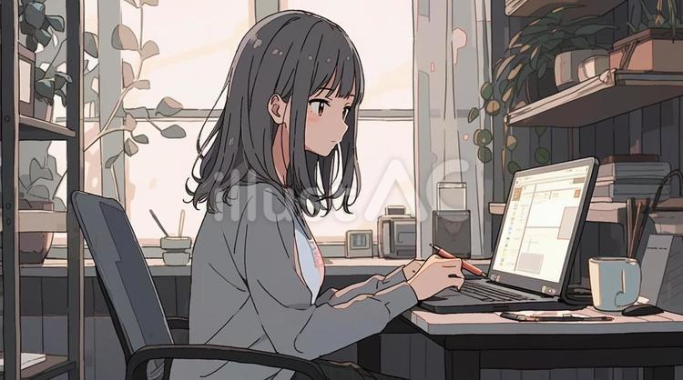 デスクでパソコン作業をしている女性のイラスト素材76612654- PIXTA。