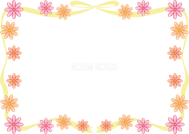 シンプルなリボンと花の枠 横 の無料 フリー イラストかわいい手描きの無料素材「てがきっず」保育園・小学校・介護施設にぴったりのフリー素材イラスト。