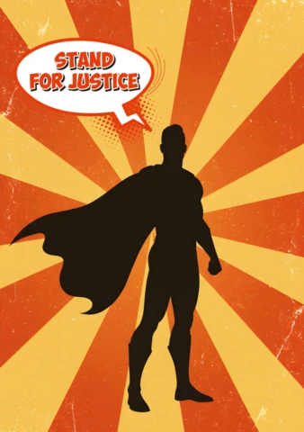 正義のために立つヒーローのシルエット、放射状のバーストと大胆なコミックポスターデザインテンプレート無料デザインテンプレート。