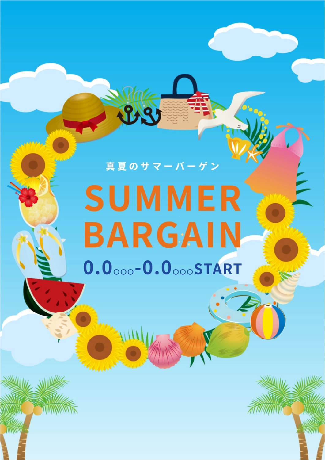 夏アイテムイラストの明るいサマーバーゲンポスターの無料ポスターテンプレート 13295 - デザインAC。