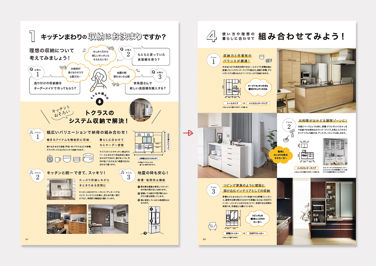 情報の多さを雑誌風の雰囲気でまとめ、ユーザーの心理に沿って構成された収納パンフレットWorks制作実績musuvime女性クリエイティブユニット 浜松。