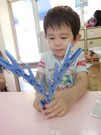 6月の制作は、ストローモビールです。 紐通しが得意なお友だちがたくさんいるので、楽しんですぃすぃ仕上げていました。完成すると、七夕飾りと一緒に飾りました。