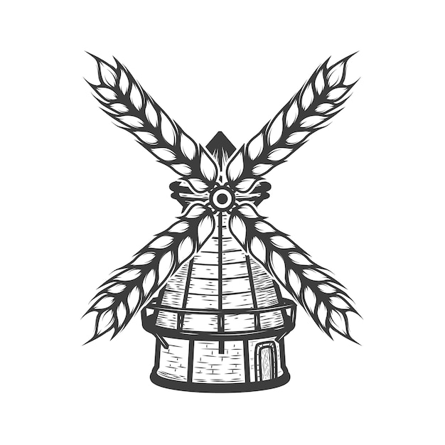 白い背景の上に小麦の風車。ロゴ、ラベル、エンブレム、記号、ブランドマークの要素。図。Premiumベクトル素材。