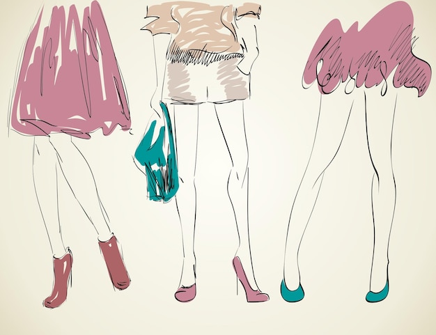 おしゃれな靴の 3 人の女の子の手描きイラストPremiumベクトル素材。