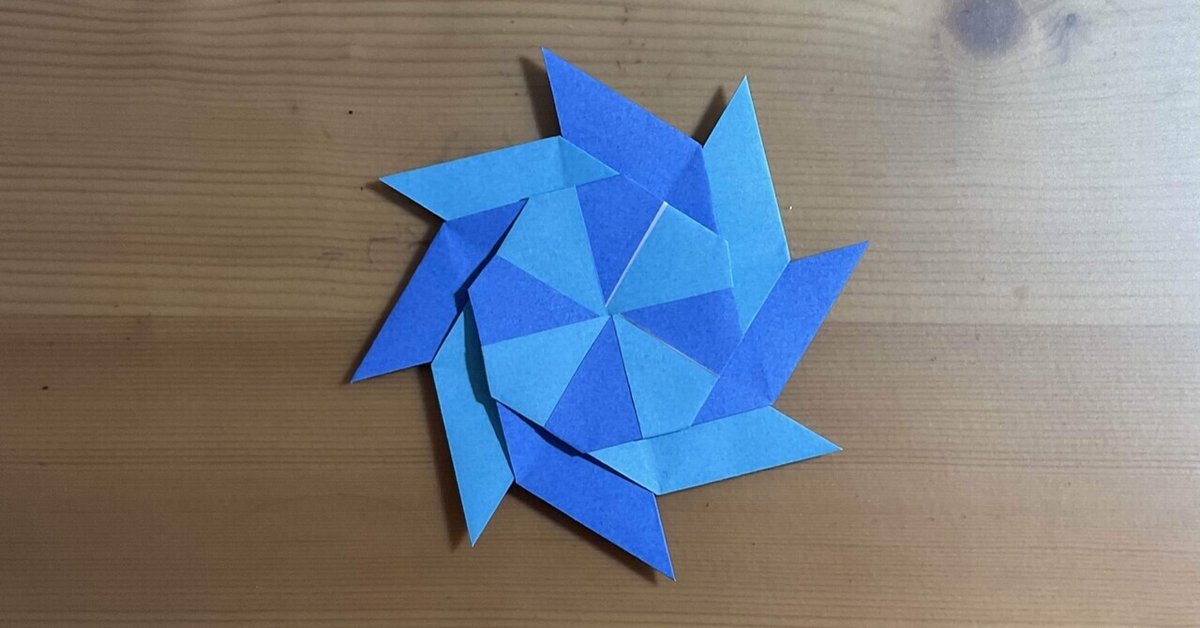 折り紙で作る手裏剣。細くて鋭い刃が渦を巻いているような形になっています。折り紙origami簡単折り紙おりがみ手裏剣ninjastarshuriken。