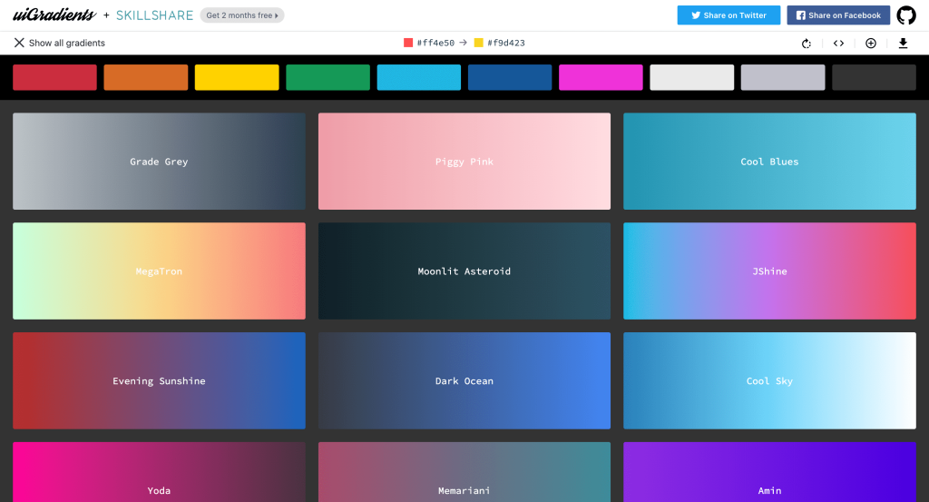 迷った時はコレグラデカラー早見表🐱 グラデーションが決まらないそんなお悩みを解決にゃ。 2つの色を指定するだけで グラデーションが出来ちゃうにゃ!🐱他の配色パターンが知りたい人は、 『Web Gradients』というサイトに 気の利いたグラデーション例がわんさか。
