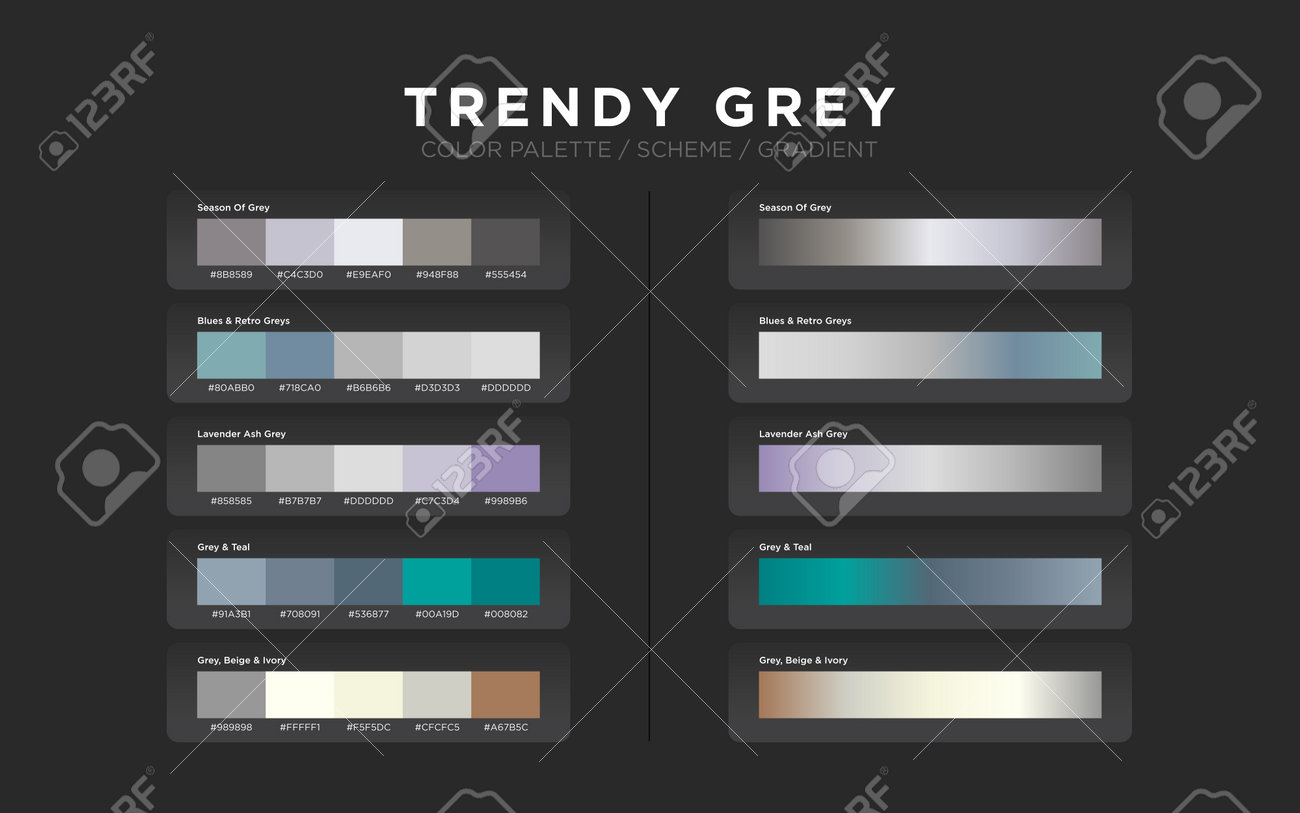 グレーのカラーパレット、配色、色のグラデーション。グラフィックレイアウト、ウェブサイトテンプレート、UIUXデザイン用の最新のウェブデザインカラーエレメントのセット。のイラスト素材・ベクター Image 197608050。