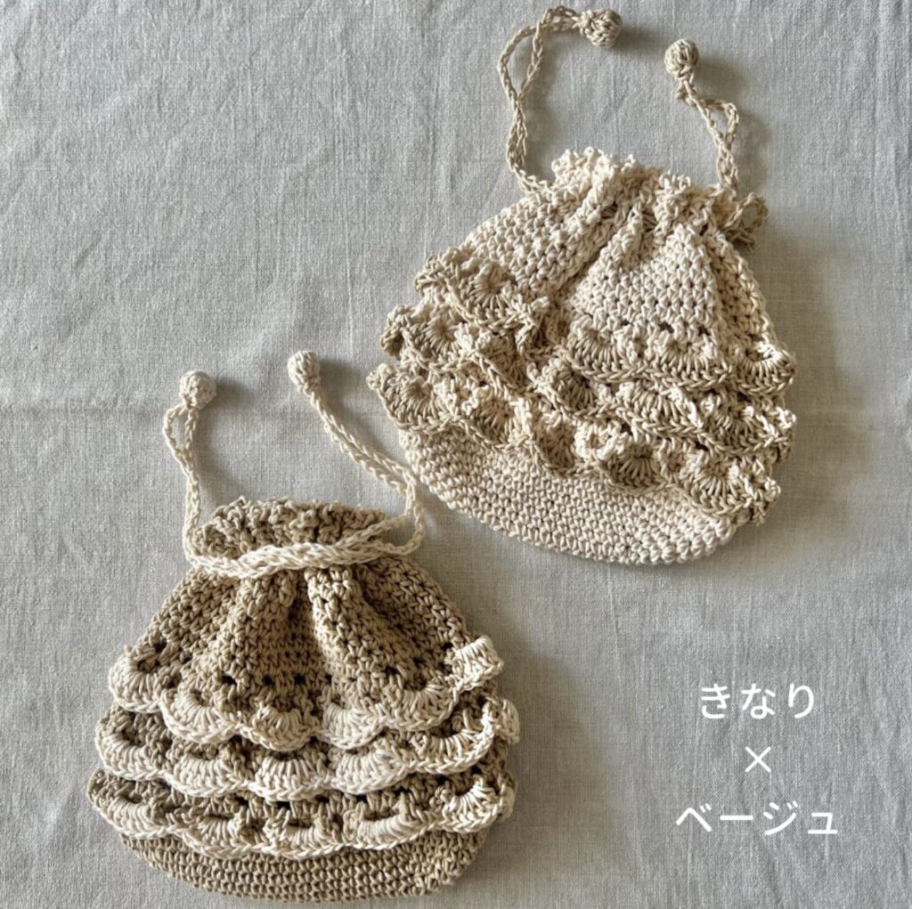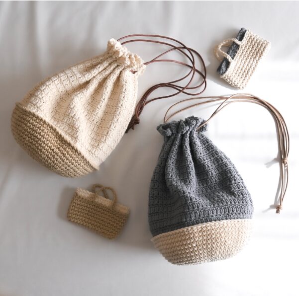 サイズ違いで楽しむ! かぎ針編みの巾着バッグ&ポーチ。