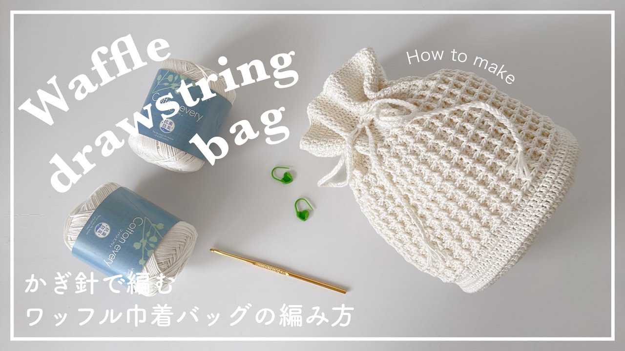 かぎ針編み かぎ針で編むワッフル巾着バッグの編み方 ワッフル編み 巾着バッグ drawstringbag knitting crochet crochet bag 코바늘 주머니 파우치 뜨개질。