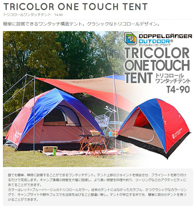楽天市場 トリコロールワンタッチテント 4人用 T4-90T490 簡単に設営できるワンタッチ構造テント。クラシックなトリコロールデザイン。ドッペルギャンガーアウトドアDOPPELGANGEROUTDOOR DOD : ツールエクスプレス 楽天市場店。