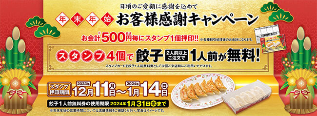 餃子の王将、スタンプを集めると“餃子2人前以上の注文で1人前が無料”になる「年末年始お客様感謝キャンペーン」 - グルメ Watch。