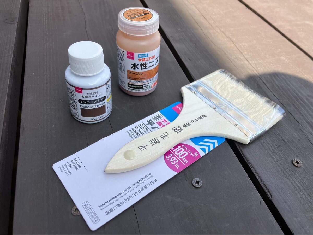 ダイソーの60cm木板にダイソーの水性ニスをダイソーのナイロン刷毛で塗るだけまけばけ試作日記。